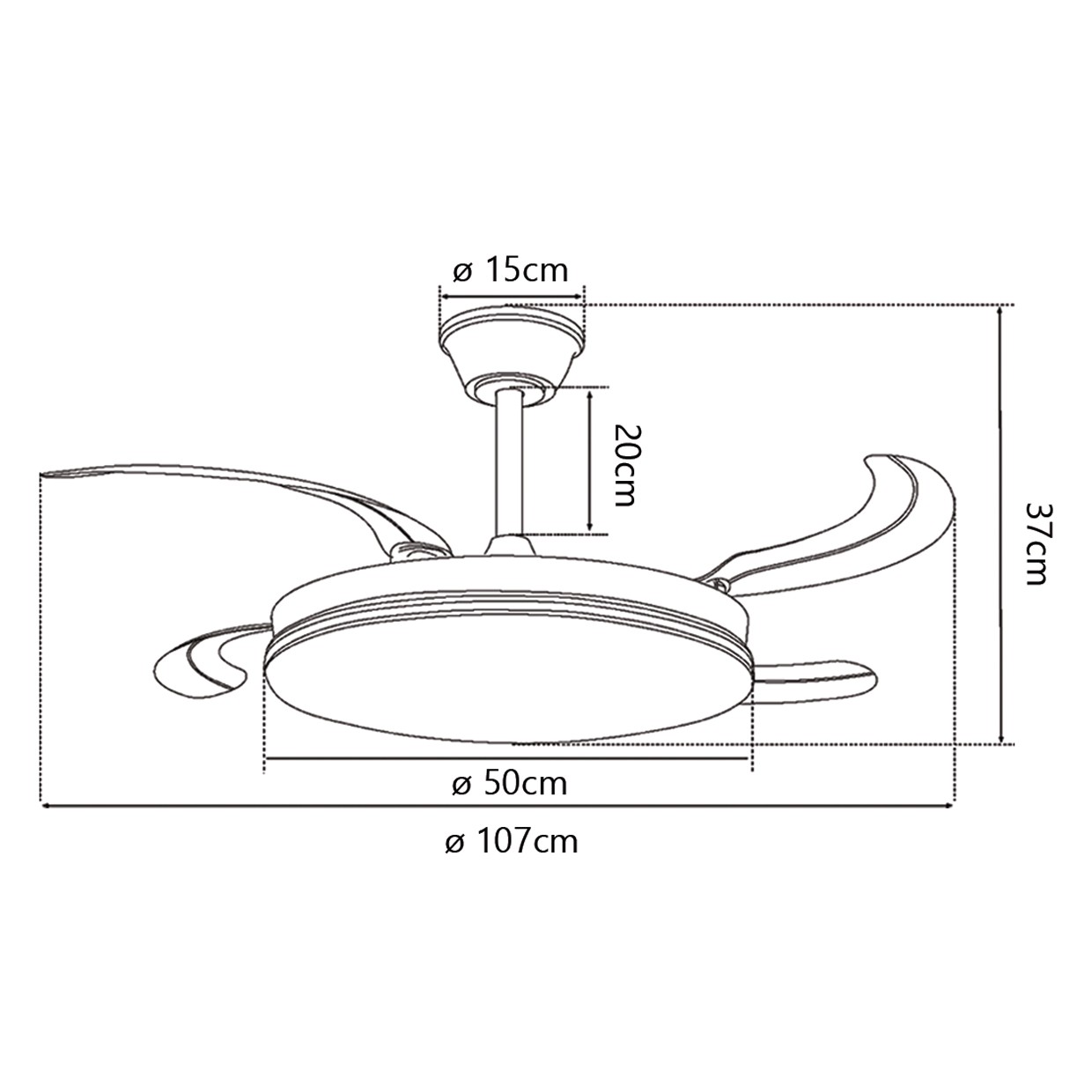MOTOR DC 30WLUZ LED 72WDIAMETRO PALAS CERRADAS: 50CMDIAMETRO PALAS ABIERTAS: 107CM4 PALAS ABSTEMPERATURA DE COLOR 3000-4000-6000KDIMABLETEMPORIZADORMODO BRISA6 VELOCIDADESREVERSIBLEMEMORIAMANDO A DISTANCIA (PILAS NO INCULIDAS)